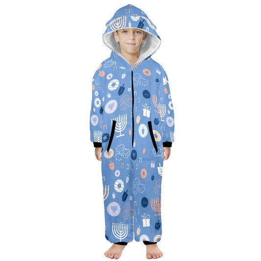 Blue Chanukah 5785 One-Piece Zip Up Hooded Pajamas for Big Kids