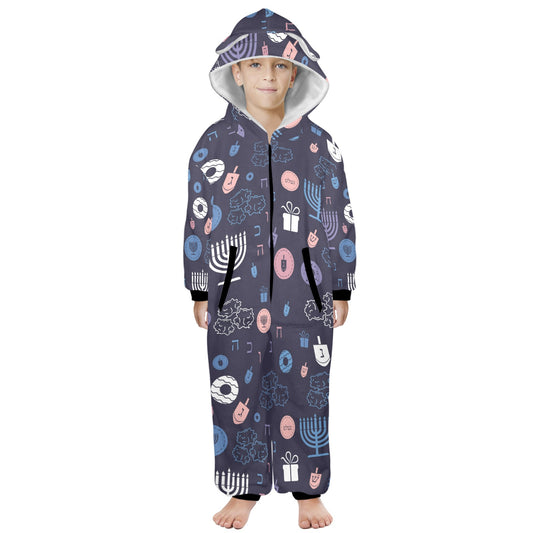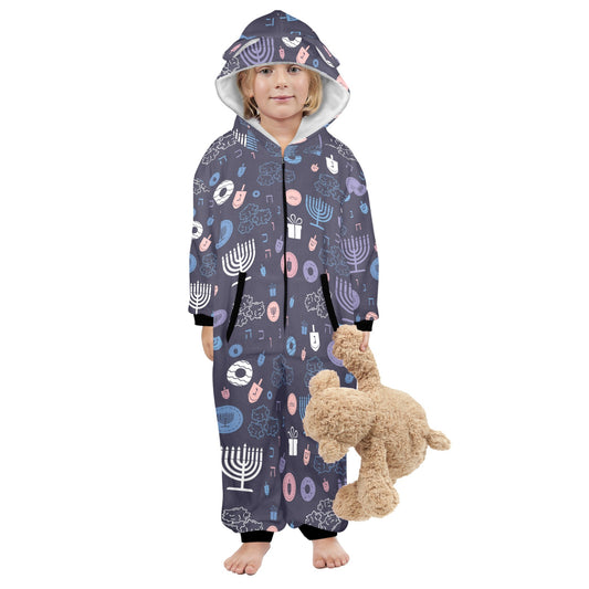 Blue Chanukah 5785 One-Piece Zip Up Hooded Pajamas for Big Kids