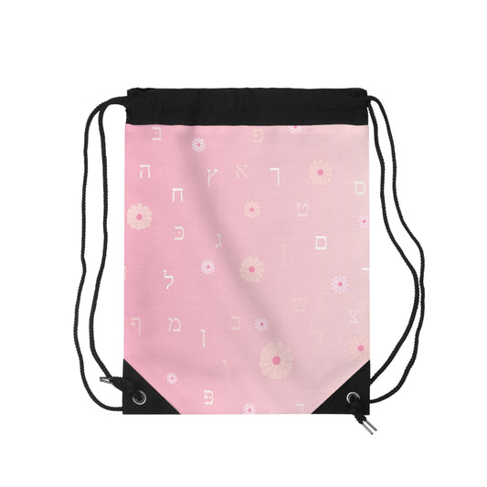 Pink Floral Drawstring Bag with Hebrew Aleph Beis Letters | Cute & Functional Gym Sack for Everyday Use