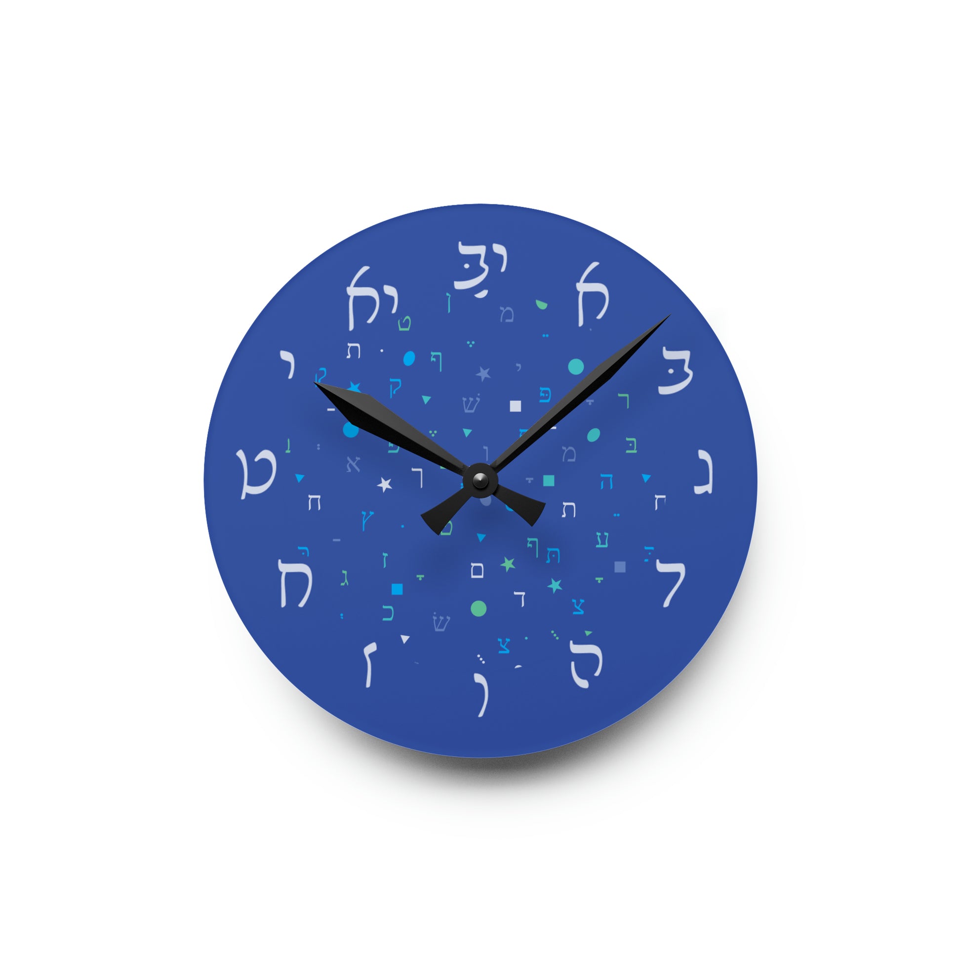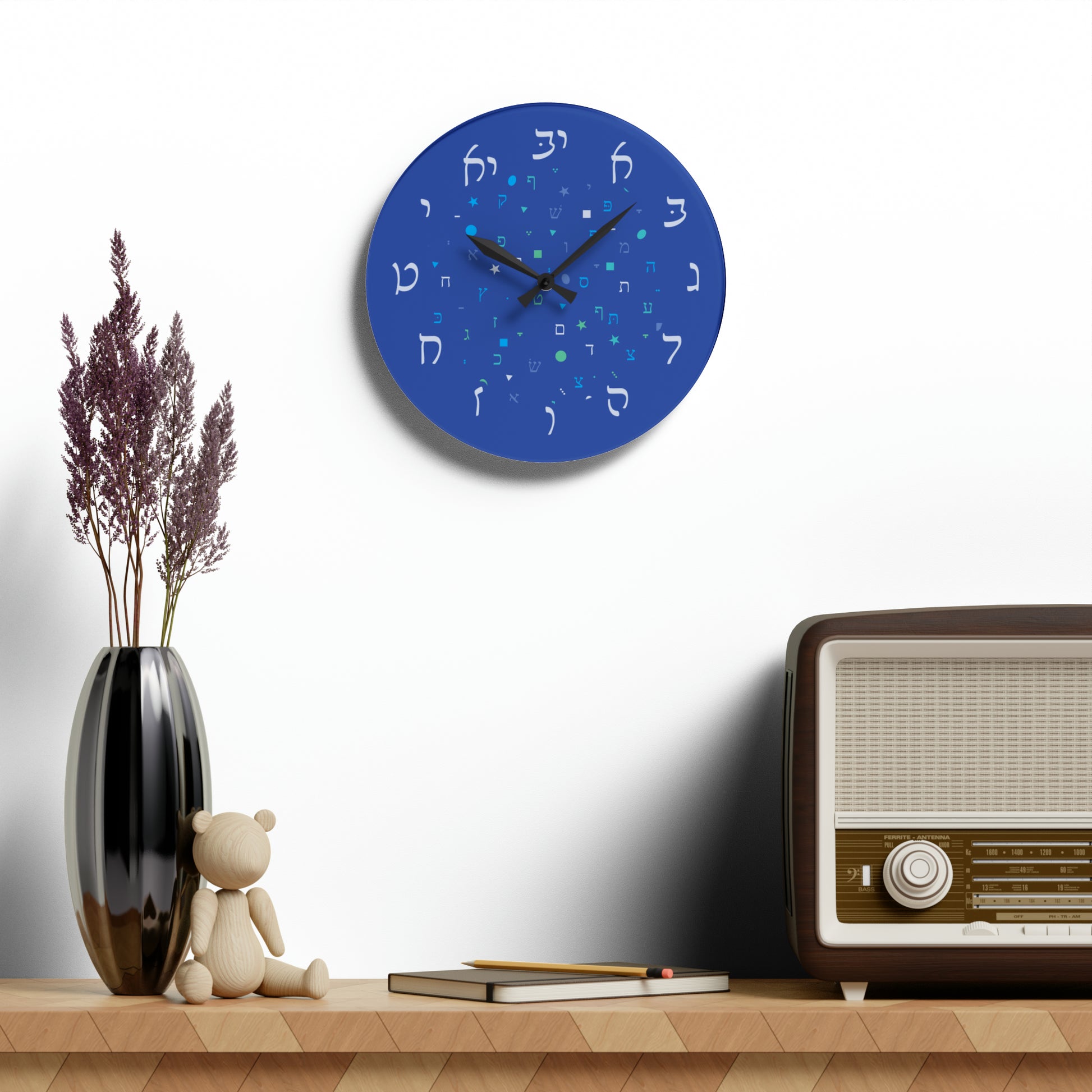 With Rashi Numbers - Dark Blue Aleph Beis Shapes Acrylic Wall Clock