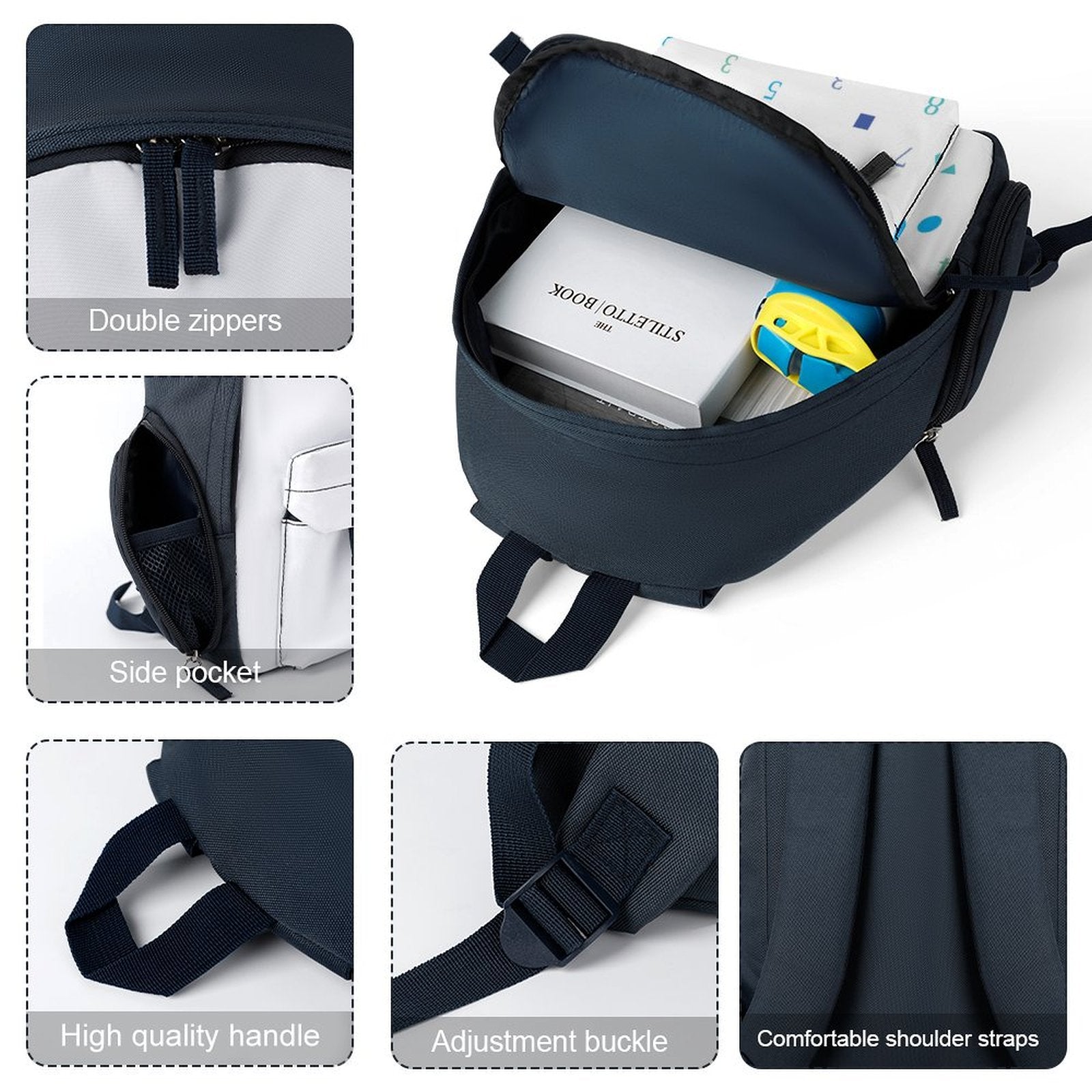 Crafted from premium polyester, this lightweight 8.68 oz schoolbag offers durability and strength for everyday use. Its spacious interior accommodates books, notebooks, folders, and binders with ease. The front compartment features a double-zipper closure, while the side pockets also zip securely, showcasing a distinctive design. Soft, cushioned shoulder straps ensure comfort and protect young shoulders. Ideal for school, travel, spring outings, and vacations, this bag is easy to maintain with simple cold water cleaning.