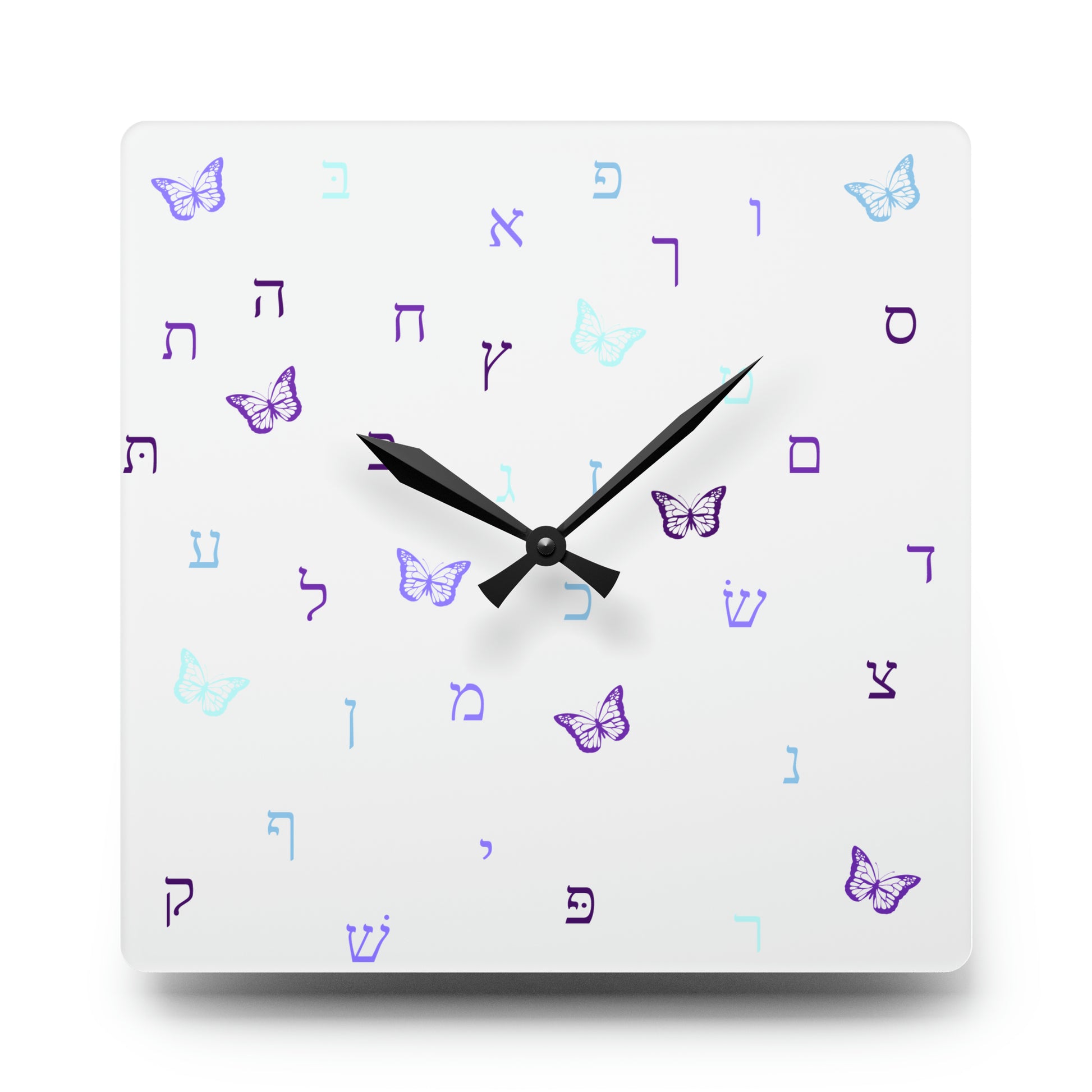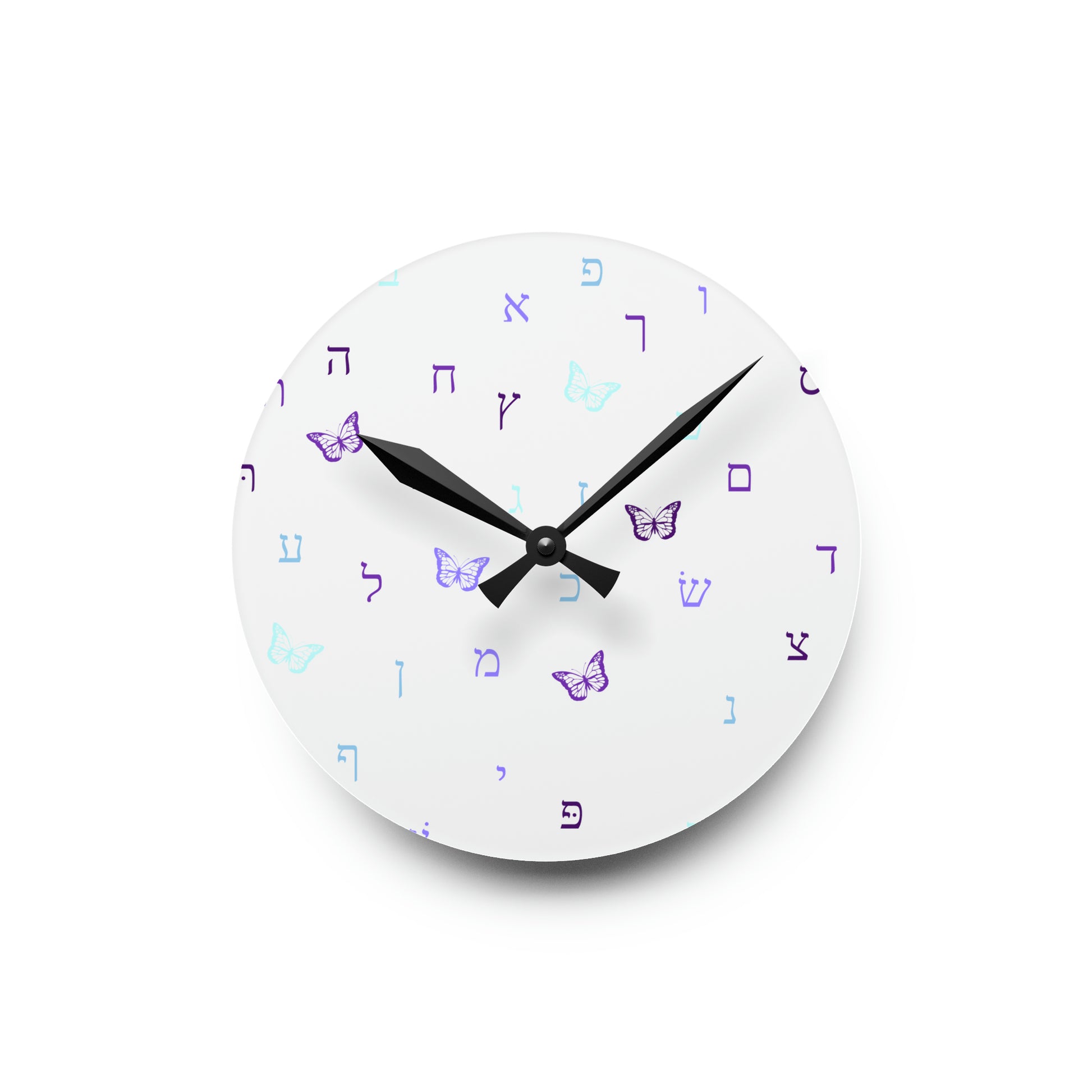 Purple Aleph Beis Butterflies Acrylic Wall Clock