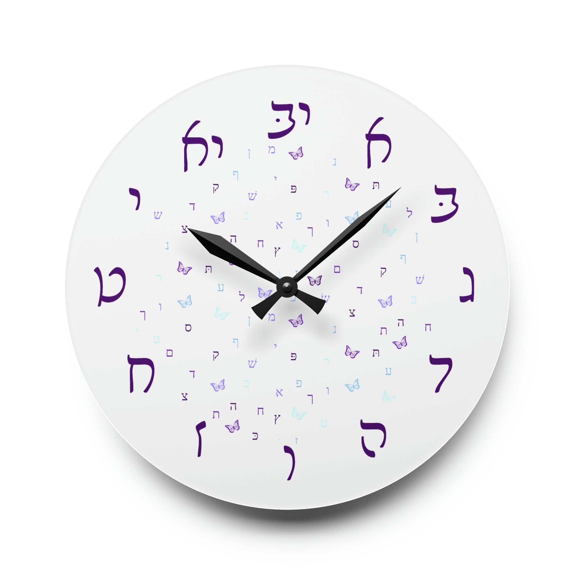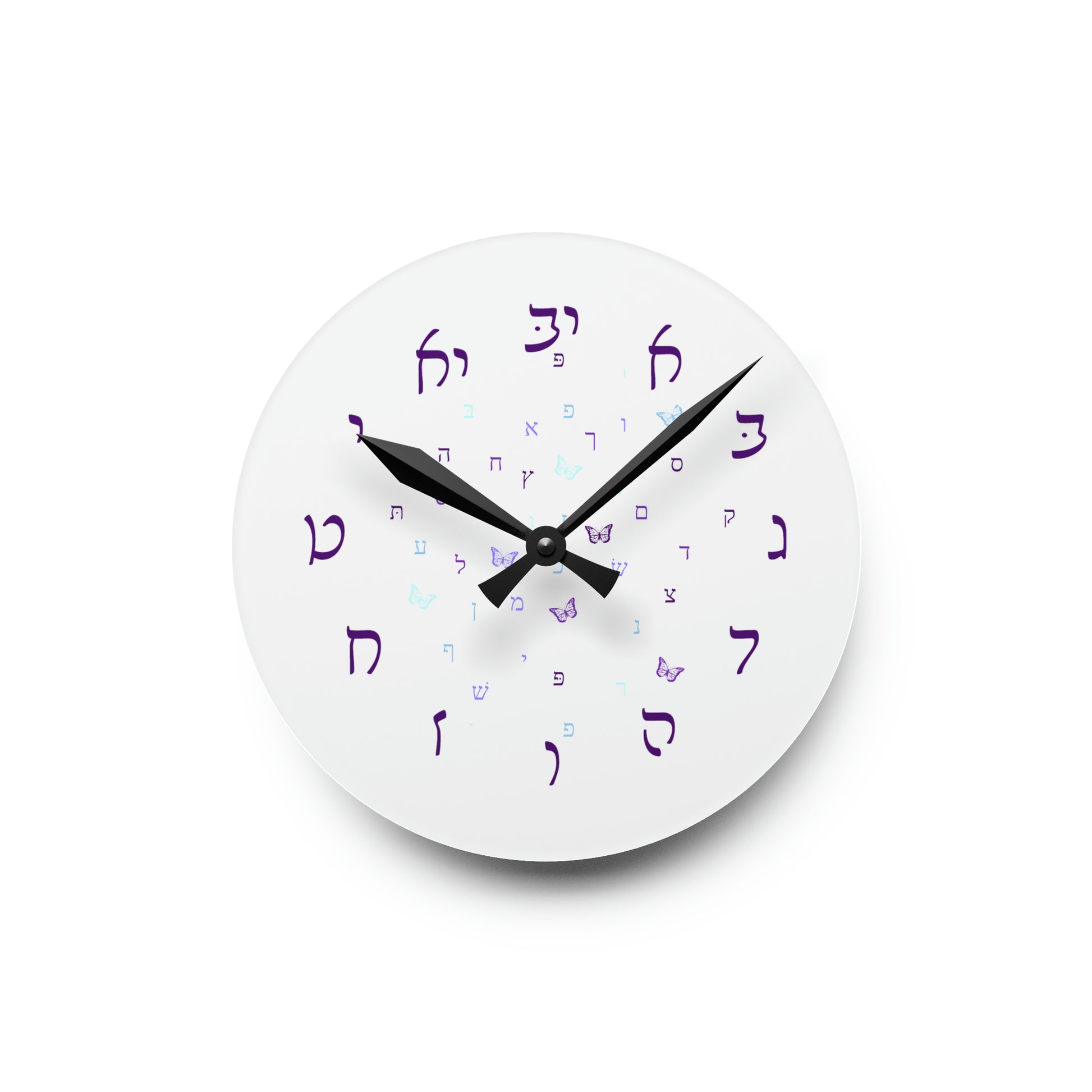 With Rashi Numbers - Purple Aleph Beis Butterflies Acrylic Wall Clock